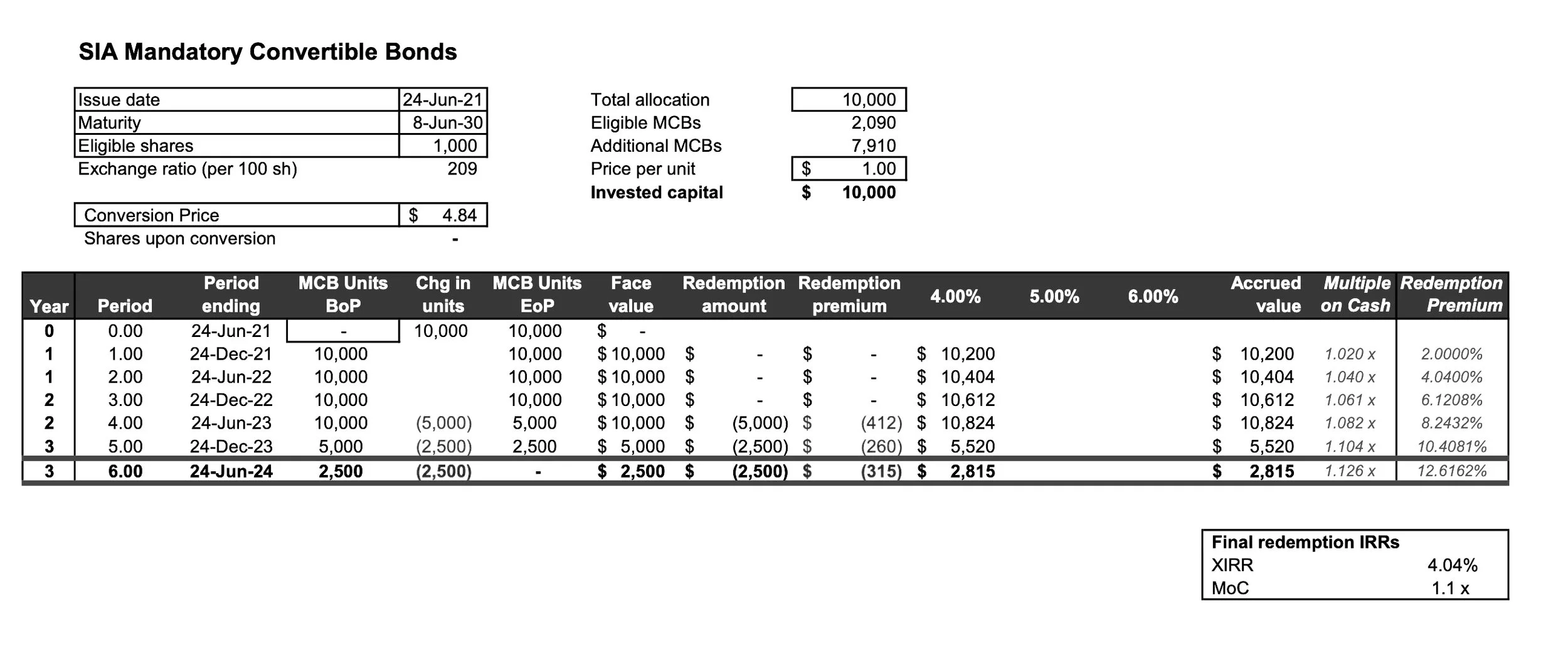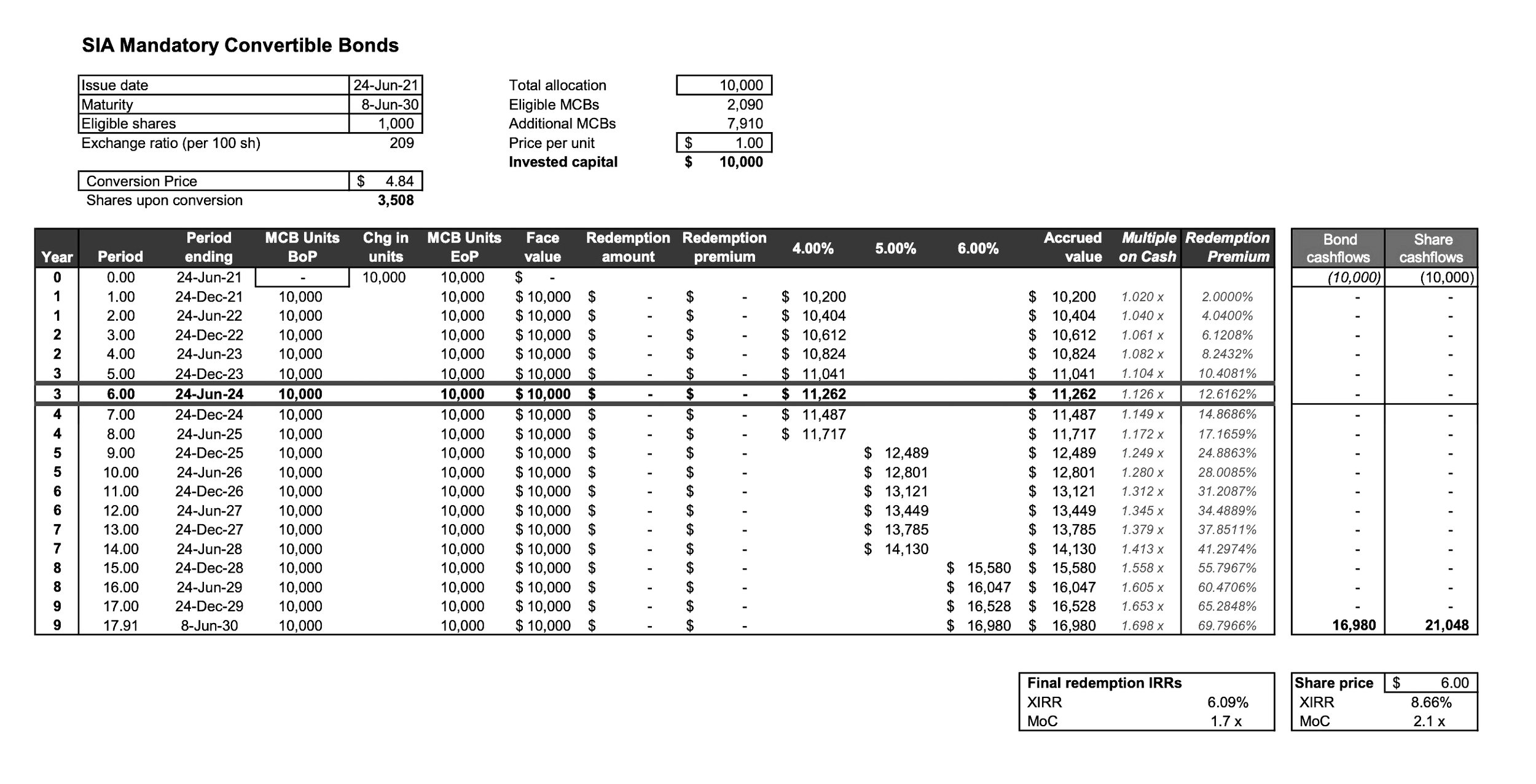 Had SIA not followed through with the redemption, allowed you to hold those bonds, and converted the face value at S$ 4.84 per share at maturity, the IRR would be closer to 8%, depending on where you think the share price lands in 2031.